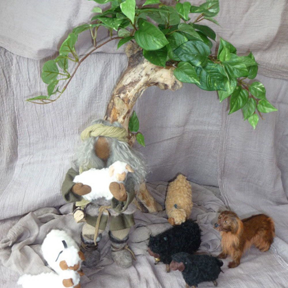 Jeder Baum ist ein Unikat. Unsere Chefin sammelt passende Schwemmholzäste am Bodensee, trägt sie ins Atelier, wäscht sie und schraubt sie auf eine Unterplatte, damit der Baum gut steht. Die Unterplatte wird mit Gazestoff abgedeckt, damit sich der Baum in jede Figurenlandschaft einfügt.
