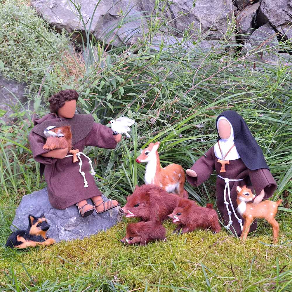 Es ranken sich die schönsten Geschichten rund um Franz von Assisi. Er konnte mit den Tieren reden und war ein Sonnenkind Gottes auf Erden. Dem haben wir Rechnung getragen mit unserem schönen Bild von Franz und Klara in der Natur mitten zwischen ihren geliebten wilden Tieren.