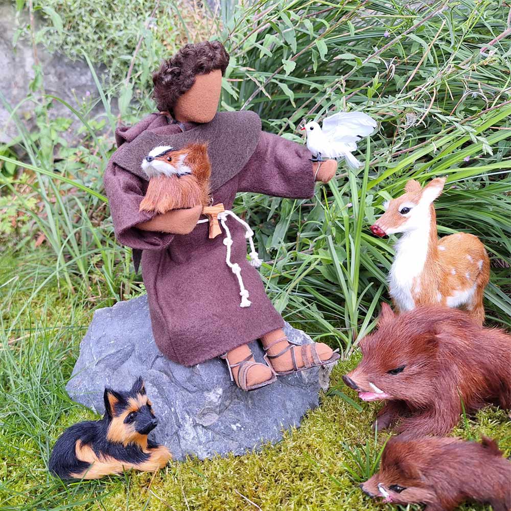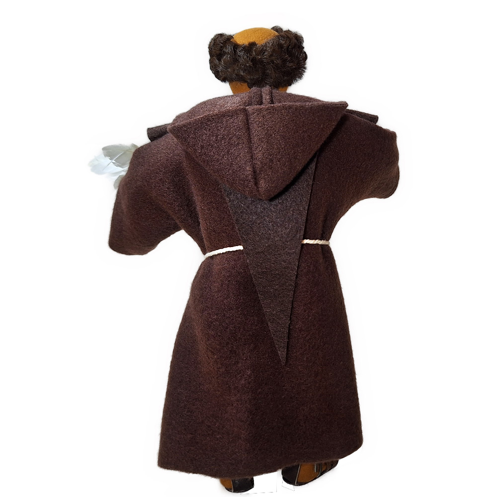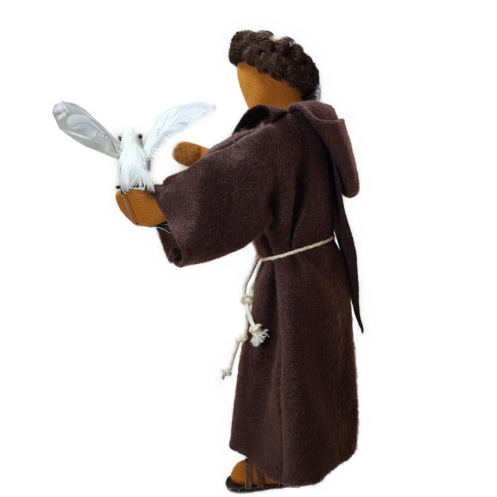 Der Heilige Franziskus ist eine der beliebtesten Figuren aus unserem Sortiment. Eine Taube hat sich vertrauensvoll auf seine Hand gesetzt. Beides verwundert nicht, denn Franz von Assisi hat eine wunderschöne Ausstrahlung auf Tauben wie auch auf Menschen. Seine Kutte ist toll gemacht mit Kapuze und dem obligatorischen Franziskanerdreieck am Rücken. Sehr besonders ist auch die Tonsur, die den Oberkopf frei lässt.