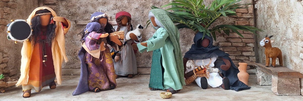 Die Geschichte Rut erzählt vom Fremd sein und Heimisch werden. Sie reist mit ihrer Schwiegermutter Noomi - beide verwitwet - nach Bethlehem, wo sie Boas kennen lernt. Beide Frauen bemühen sich, dass er Rut heiratet, denn nur so sind sie sicher und auf Dauer überlebensfähig.Unsere Rut trägt ein bequemes Reisekleid mit großem Schleiertuch, um sich für die Reise gut bedecken zu können. Sie hat drei Körbe mit dabei, in denen sie ihre Habseligkeiten verstauen kann.
