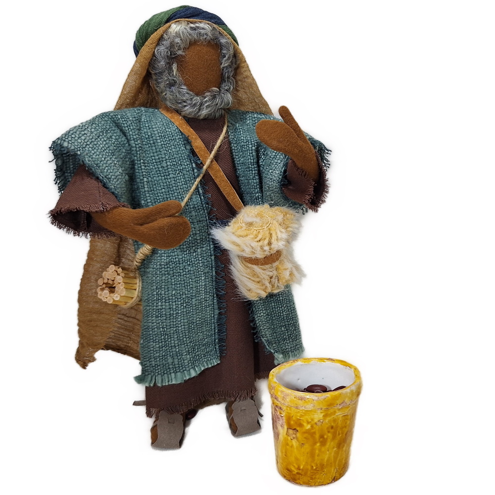 Hagar ist Saras schöne Sklavin. Abraham nimmt sie zur Zweitfrau, weil er mit Sara kein Kind bekommt. Welche Spannungen das gegeben hat, bleibt unserer Fantasie überlassen. Leicht war es sicher nicht. Aber wichtig, denn Hagar gebiert Ismael und ist somit die Urmutter des Zwölf-Stämmevolks der nordarabischen Ismaeliter.Du bekommst Hagar mit all ihren Utensilien und dem Tontopf im handgeknüpften Netz.