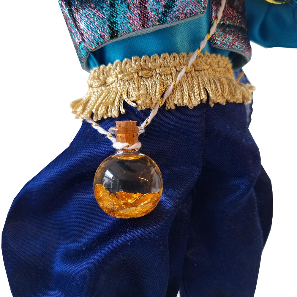 Ich habe diese Flaschen auf einer Messe gefunden und wollte sie gerne meinen Kunden zur Verfügung stellen, weil sie an unseren Figuren sehr toll wirken. Wir haben sie durch eine schöne goldglitzernde Schnur ergänzt, die zum Umhängen an die Figur benötigt wird.