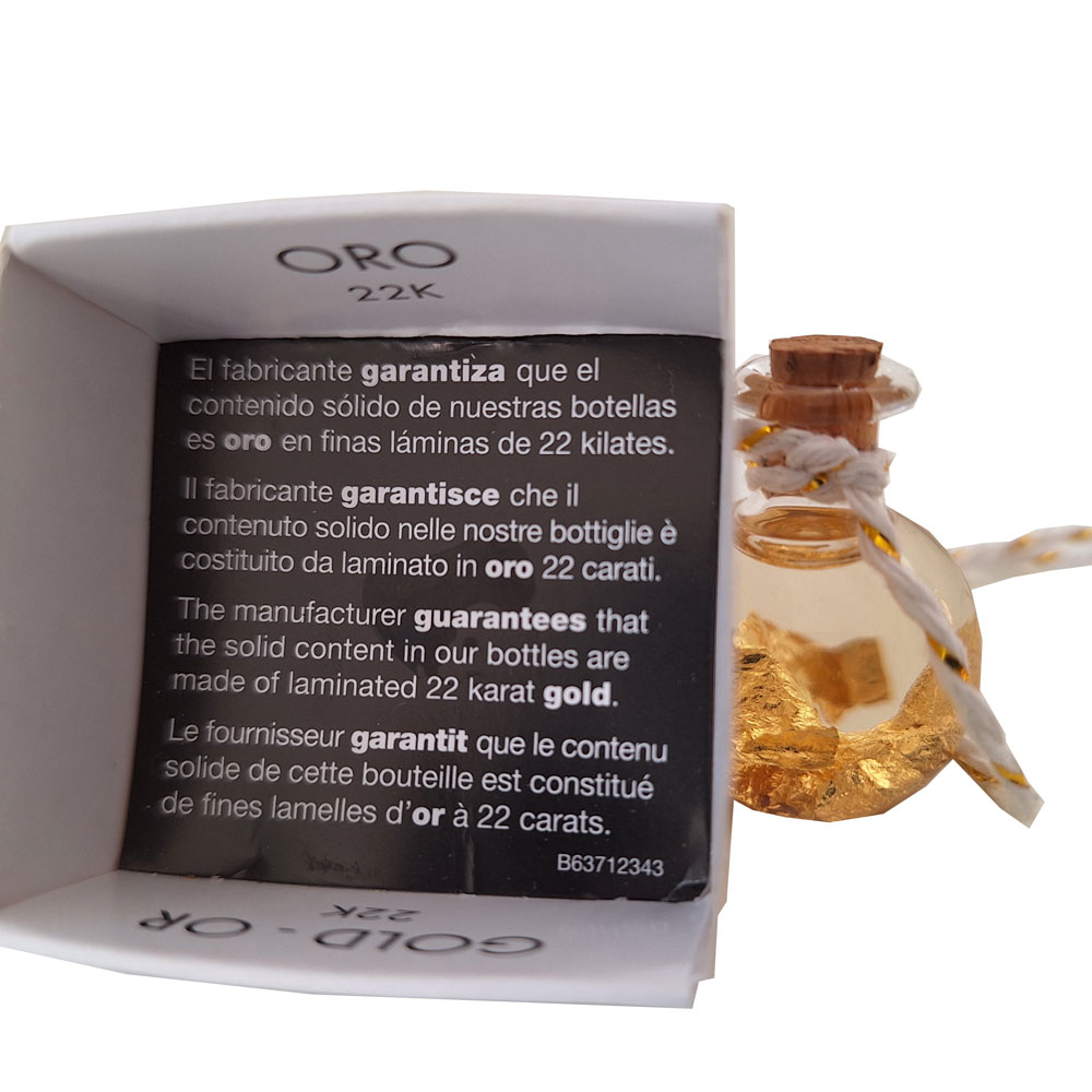 Das Besondere daran: In der 3,3cm hohen Flasche schwimmt ECHTES 22 Karat Plattgold. Das garantiert der Händler mit dem mitgelieferten Zertifikat. Und es ist auch glaubwürdig, denn Plattgold wird ja auch auf edles Essen gegeben, ist somit heutzutage erschwinglich geworden.
