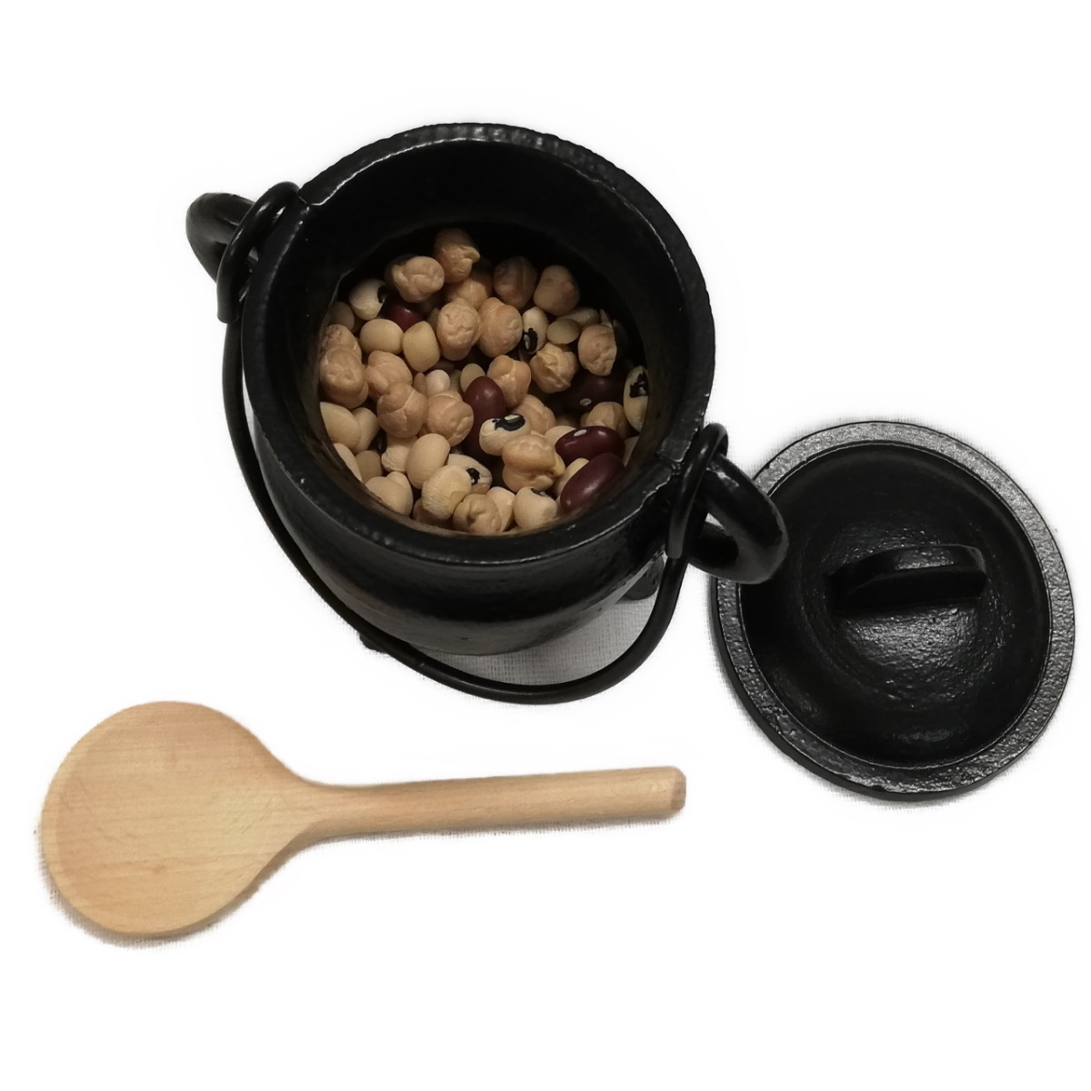 Wenn die Hirten auf dem Felde sich treffen, kochen sie sich ein gutes Süppchen in diesem schweren, gußeisenen Topf aus sehr wertigem Material. Wir haben Holzscheite zum Anfeuern, Erbsen und Bohnen für die Suppe und einen Holzlöffel beigelegt.