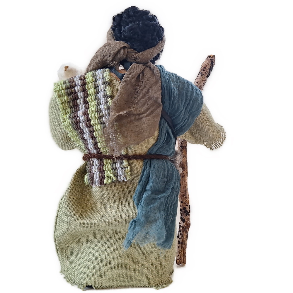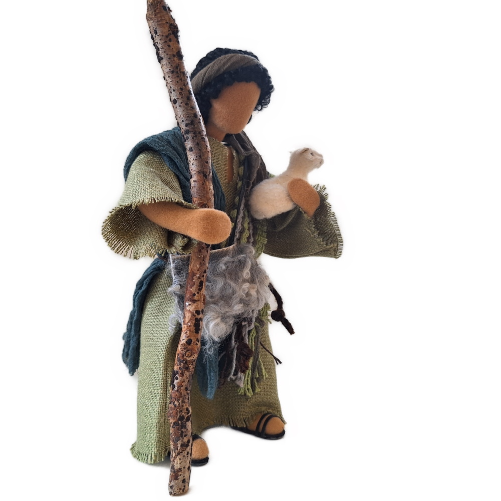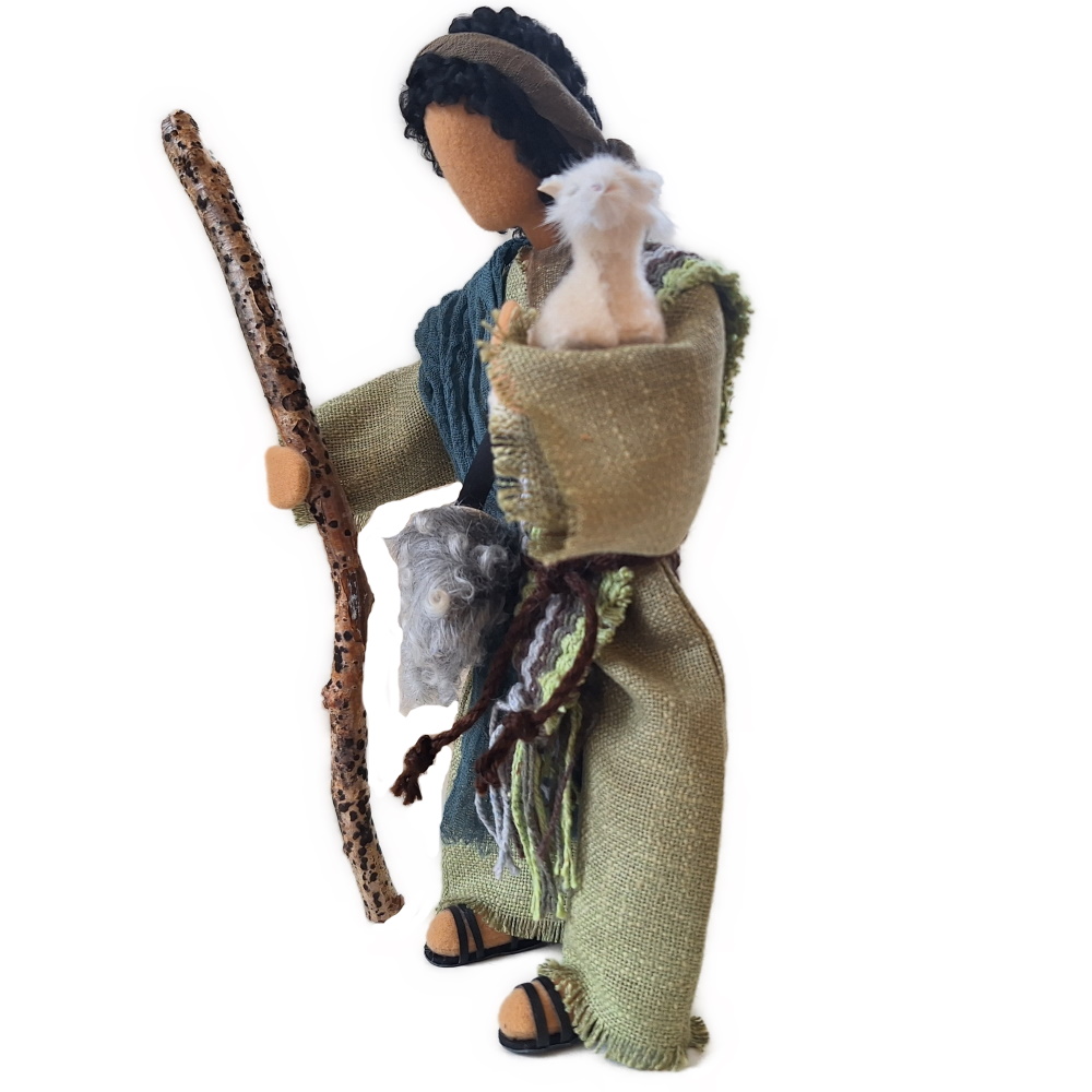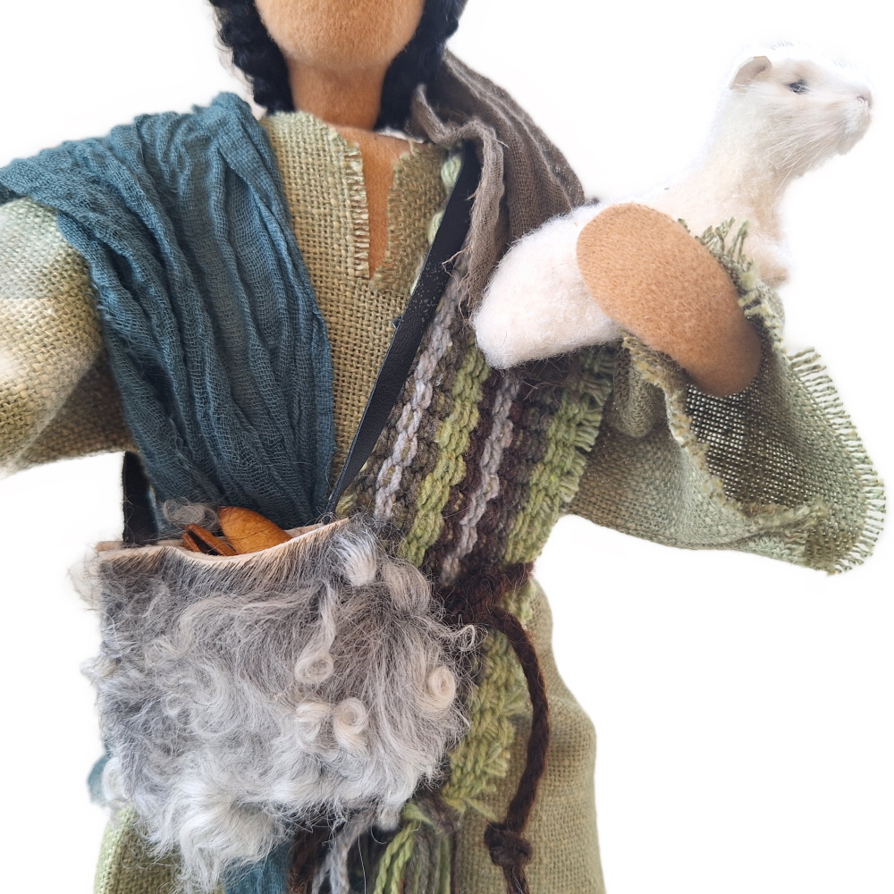 Der gute Hirte hat sein Lämmchen gefunden und trägt es freudig zur Herde zurück. Der junge Mann sieht sehr sanftmütig aus aufgrund der zarten Grüntöne seiner Kleidung, die seinen Charakter unterstreichen. Er hat eine schöne gefüllte Felltasche umgebunden und einen Naturstab.