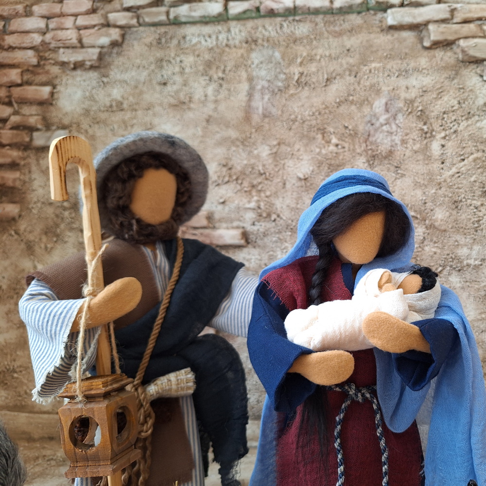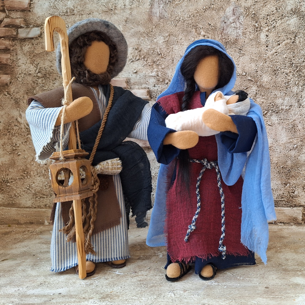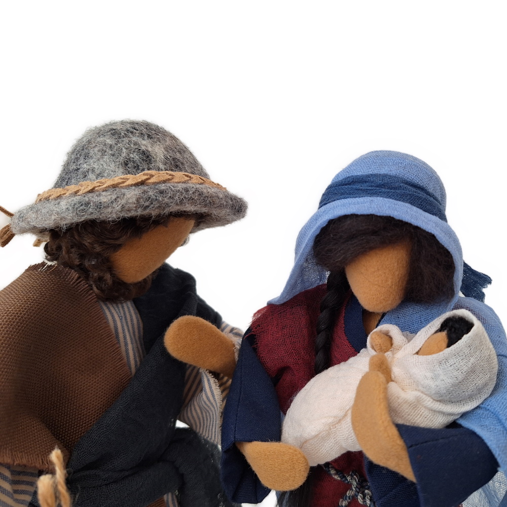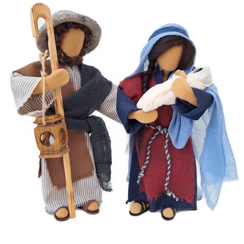 Maria ist in blau-rot gekleidet und trägt liebevoll ihr Kind im Arm. Das Jesuskind ist aufwändig mit Händchen gefertigt. Die kann es ablegen oder der Mutter freudig entgegenstrecken. Josef trägt einen handgefilzten Hut und ist farblich passend zur Maria gekleidet. Die handgefertigte Laterne und der geschnitzte Stab machen die Szene perfekt.