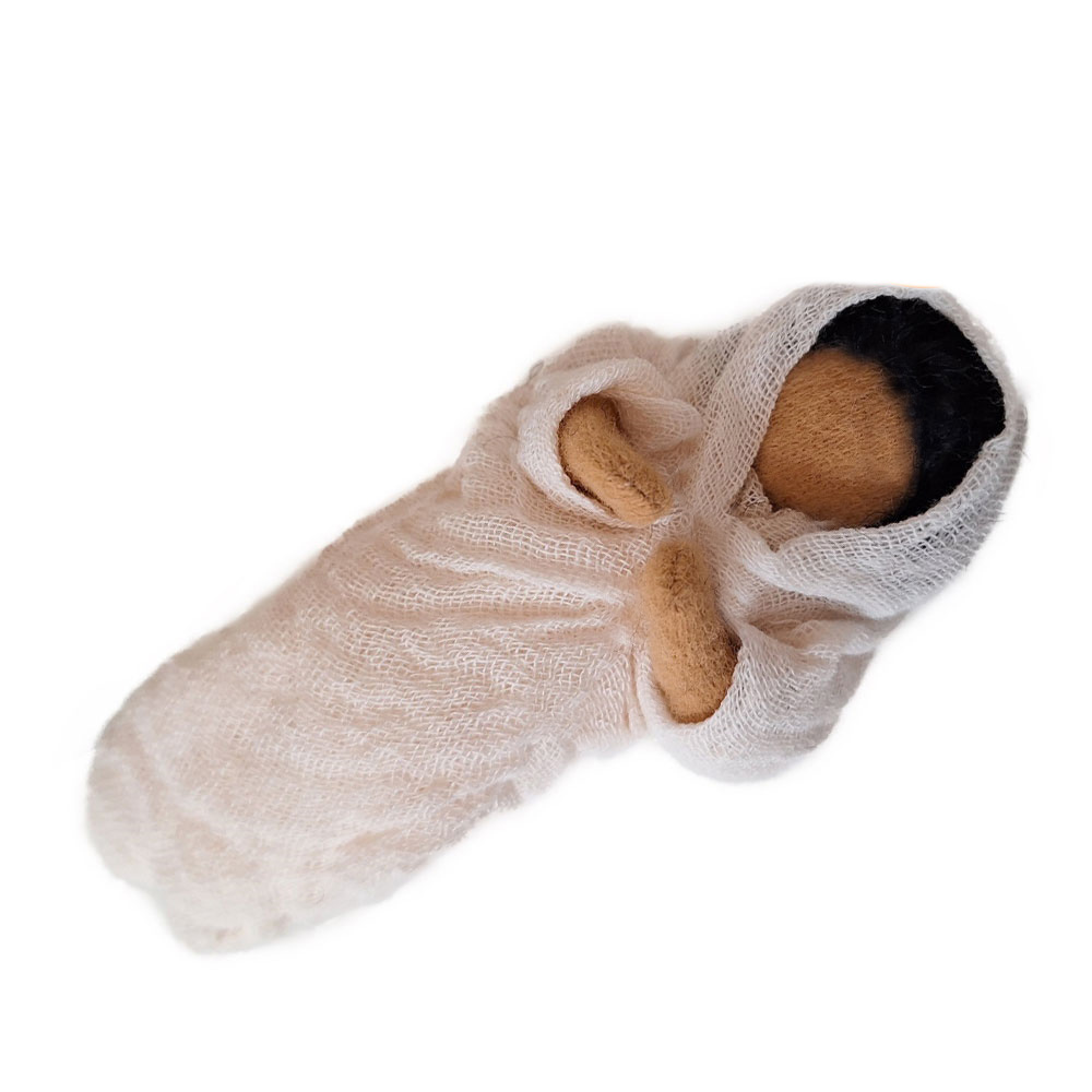 Das Jesuskind liegt friedlich in der Krippe und streckt die Ärmchen in die Höhe. Wenn es schläft, liegen die Ärmchen flach. Das Kind ist fix in seine Windel eingenäht. Die Krippe ist aus Holz, das Heu liefern wir mit.Länge Jesuskind: 11cmMaße der Krippe: 13cm lang - 9cm breit - 7cm lang