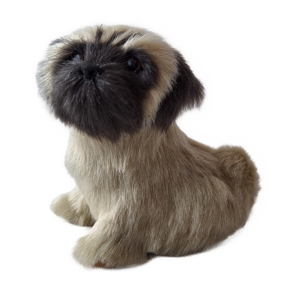 Der braune Hund sieht sehr authentisch aus, wie er da friedlich am Boden liegt. Er ist sehr schön und detailreich aus Plüschstoff, der fast aussieht wie echtes Fell, gefertigt. er hat hellbraun-beiges Fell und eine schöne graue Schnauze und graue Ohren.