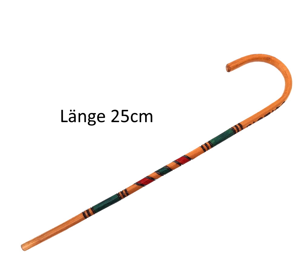 Unser Hirtenstab ist ein sehr einzigartiges Produkt und ein Sozialprojekt. Wir unterstützen damit eine alte Dame im Baltikum, eine von weltweit nur noch vier Personen, die diese Wanderstäbe in alter Tradition heute noch herstellen - für uns im Miniformat. Weidenäste werden geschnitten, genässt und über eine Eisenform gespannt, wo sie trocknen müssen. Dann wird der Stab HÄNDISCH mit traditionellen Mustern verziert. Es wird geritzt, bemalt und lackiert in immer etwas abgewandelter Form, sodass jeder Stab ein individuelles Einzelstück ist.