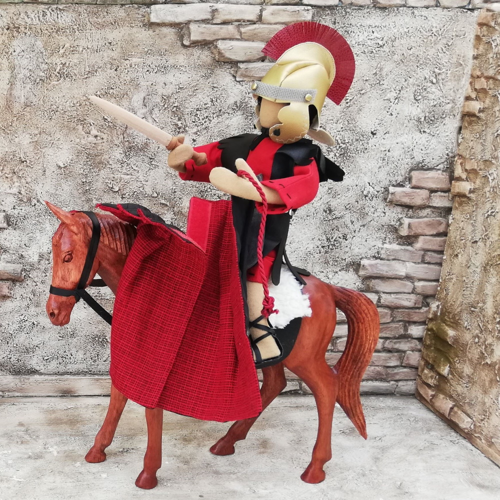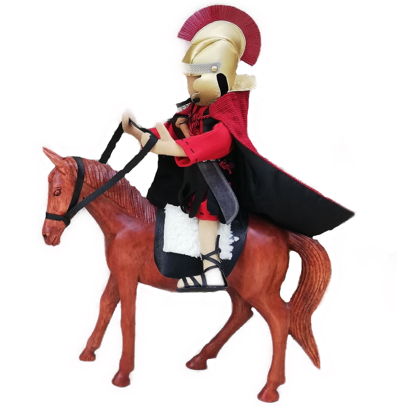 Die Pferde werden exklusiv für uns von Kunsthandwerkern in Asien gefertigt. Wir verzieren sie mit doppelter Satteldecke aus Leder und Fell sowie einer Ledertrense. Der Sattel war zur Zeit der römischen Legionen noch nicht erfunden.