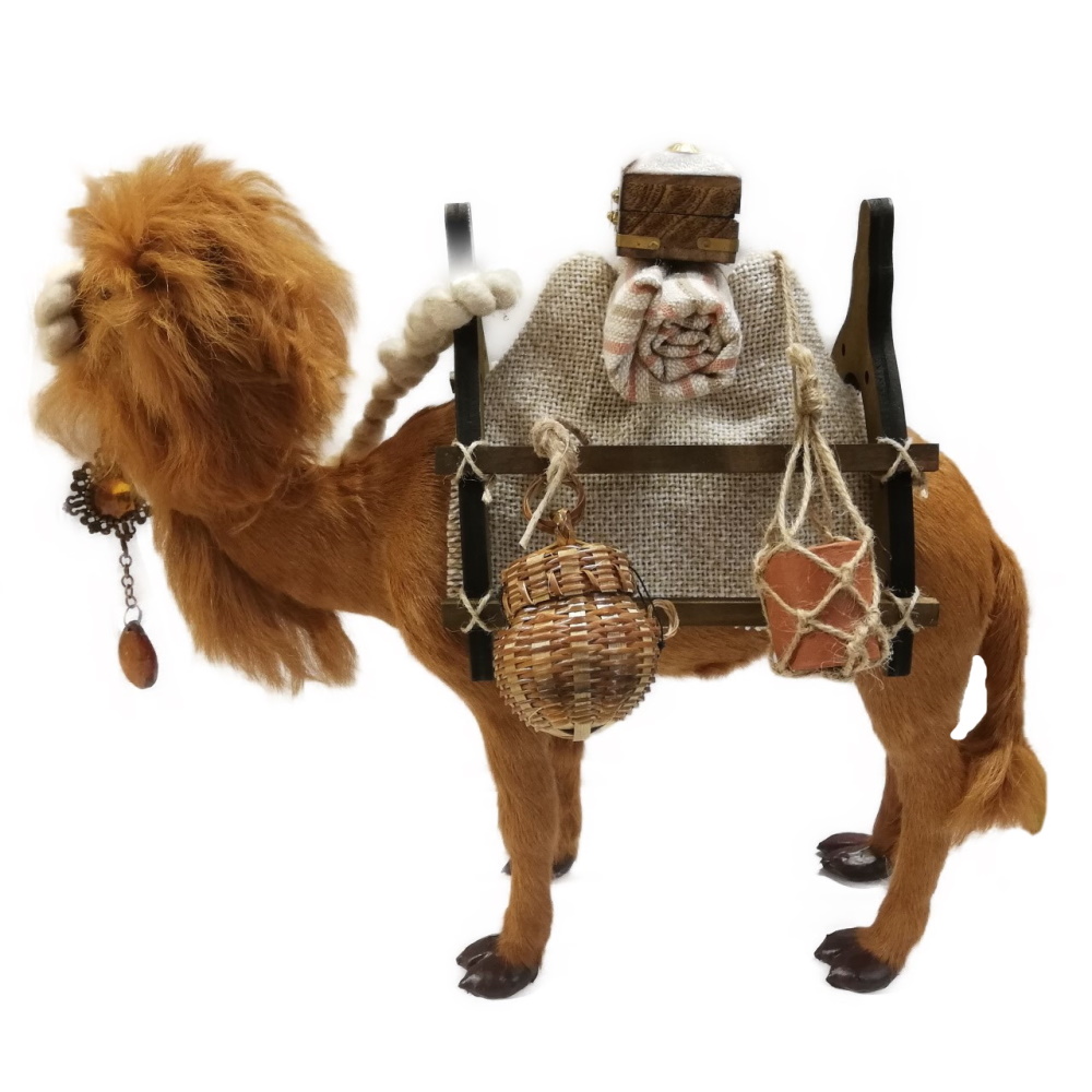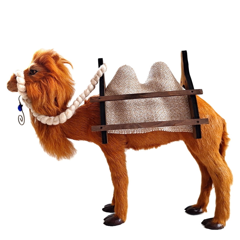 Das prächtige Tier ist 35 cm hoch und 40 cm lang. Du erhältst es zusammen mit dem handgefertigten Holzsattel und der Satteldecke sowie einer Trense aus Wollschnur mit Hängeornament.