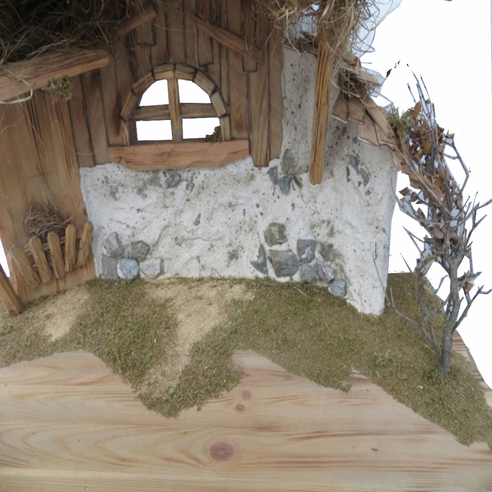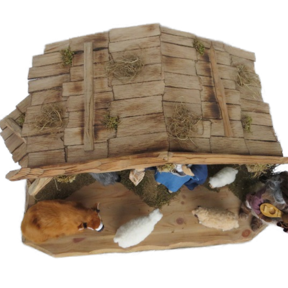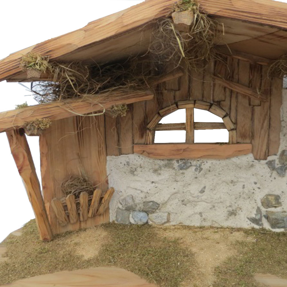 * Viele liebevolle Details, die in Einzelheiten voneinander abweichen können: Das Stroh zwischen den Balken, das gemauerte Seitenteil, die handgeschnitzten Balken, das schön gedeckte Dach... Die Krippe ist beliebig seitwärts erweiterbar. Mit Schachteln bauen Sie eine hügelige Landschaft, decken mit Gaze ab und schon können auch die Hirten am Lagerfeuer, die Heiligen Drei Könige, Kinder, Tiere und viele mehr am Weihnachtsgeschehen teilhaben.