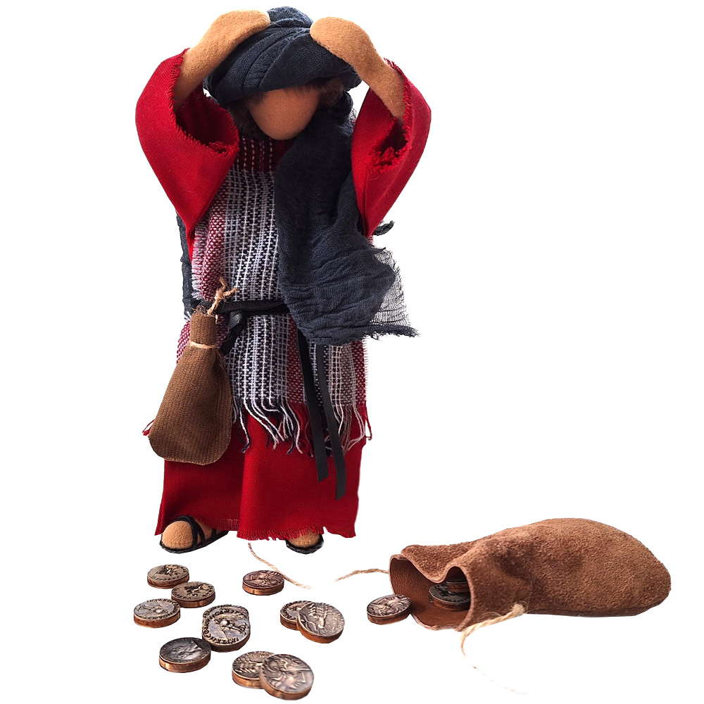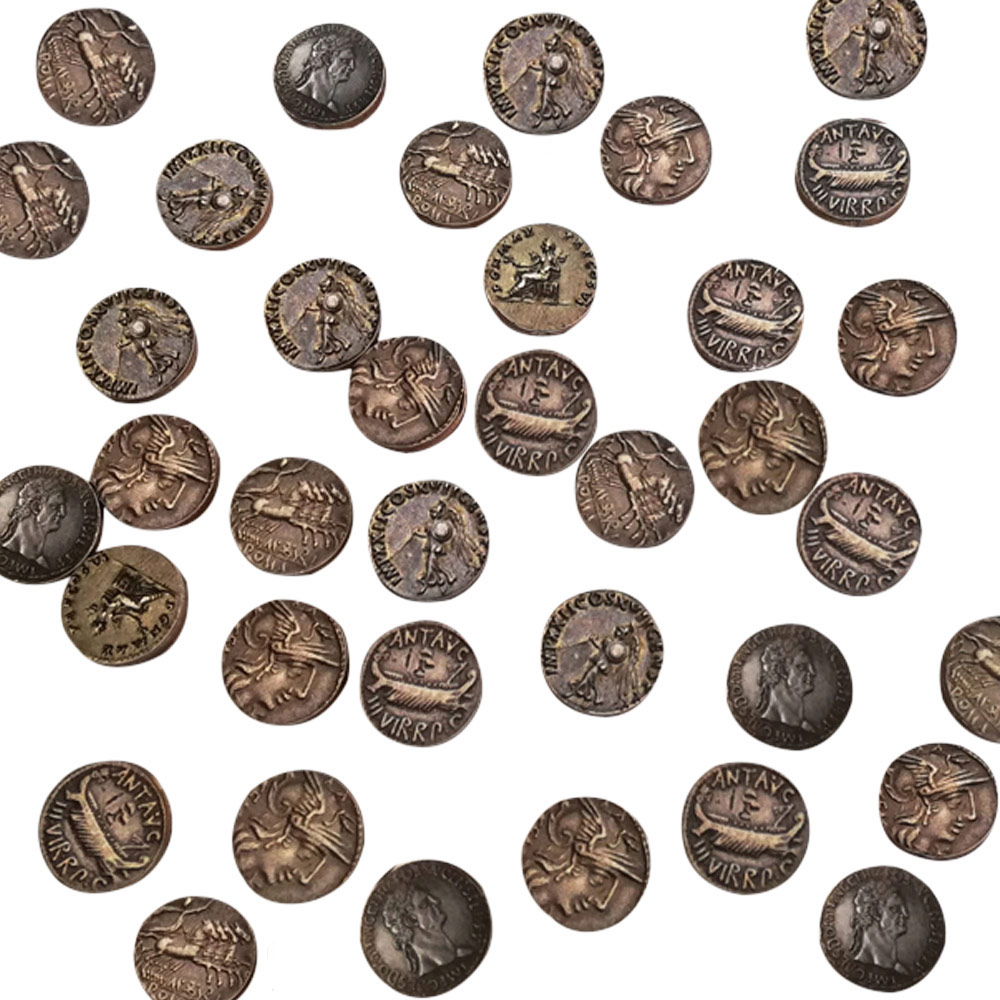 Judas hat 30 Silberlinge bekommen für den Verrat an Jesus. Wir haben römische Münzen "prägen" lassen und du bekommst 31 Stück in einem handgenähten Lederbeutel.