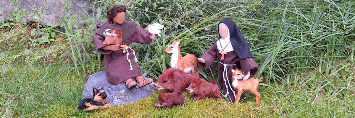Der Heilige Franziskus ist eine der beliebtesten Figuren aus unserem Sortiment. Wen wundert's, hat er auch eine wunderschöne Ausstrahlung und eine toll gemachte Kutte mit Kapuze und dem obligatorischen Franziskanerdreieck am Rücken. Sehr besonders ist auch die Tonsur, die den Oberkopf frei lässt. Es ranken sich die schönsten Geschichten rund um Franz von Assisi. Er konnte mit den Tieren reden und war ein Sonnenkind Gottes auf Erden. Dem haben wir Rechnung getragen bei unserem schönen Bild von Franz und Klara in der Natur mitten zwischen ihren geliebten wilden Tieren.