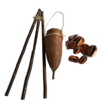 An diesem schönen Zubehörset ist alles aus natürlichen Materialien.  Das Dreibein ist aus Weidenstäben gefertigt und in der sehr schönen länglichen Naturfrucht werden Samen aufbewahrt.