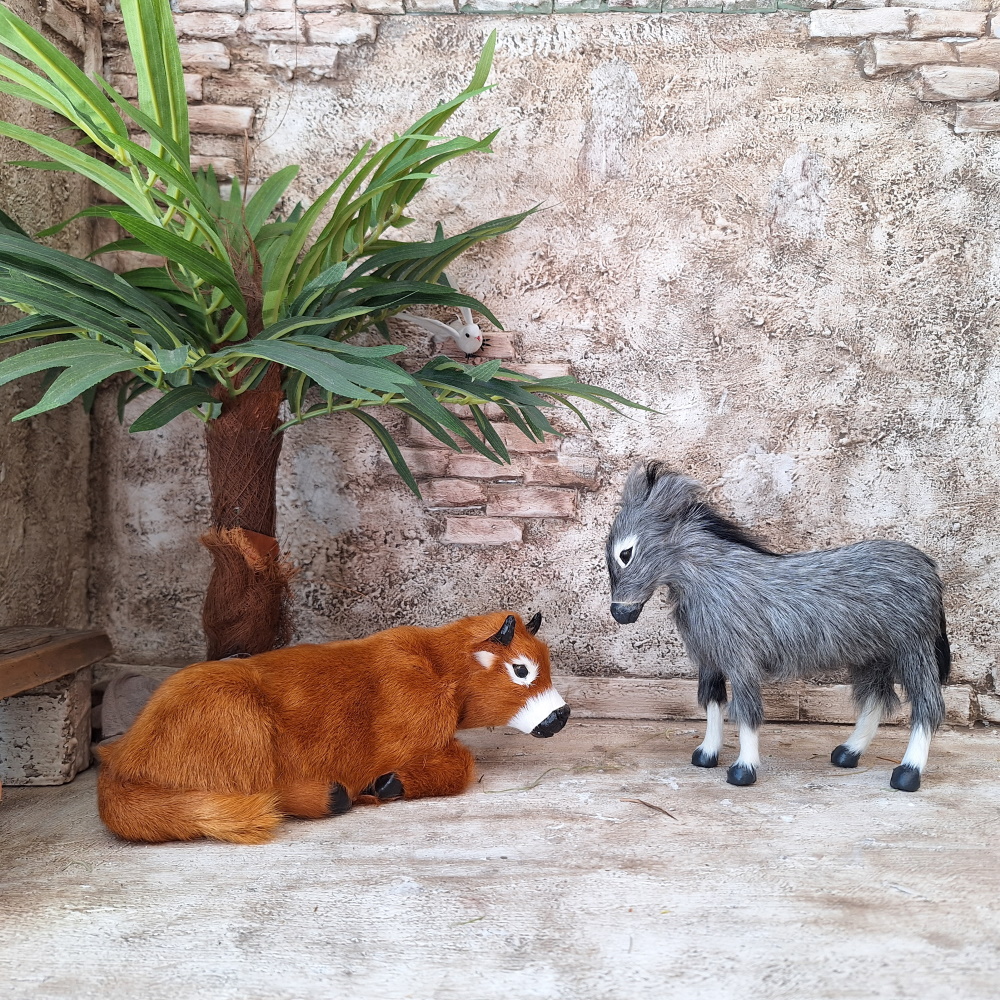 Das stehende Tier ist zu den Erzählfiguren ein Kalb. Für Figuren mit einer Höhe von 12-15cm Größe kann es als Ochse in die Weihnachtskrippe verwendet werden.Die Kuh/der Ochse ist sehr detailreich aus Rinderfell gefertigt.