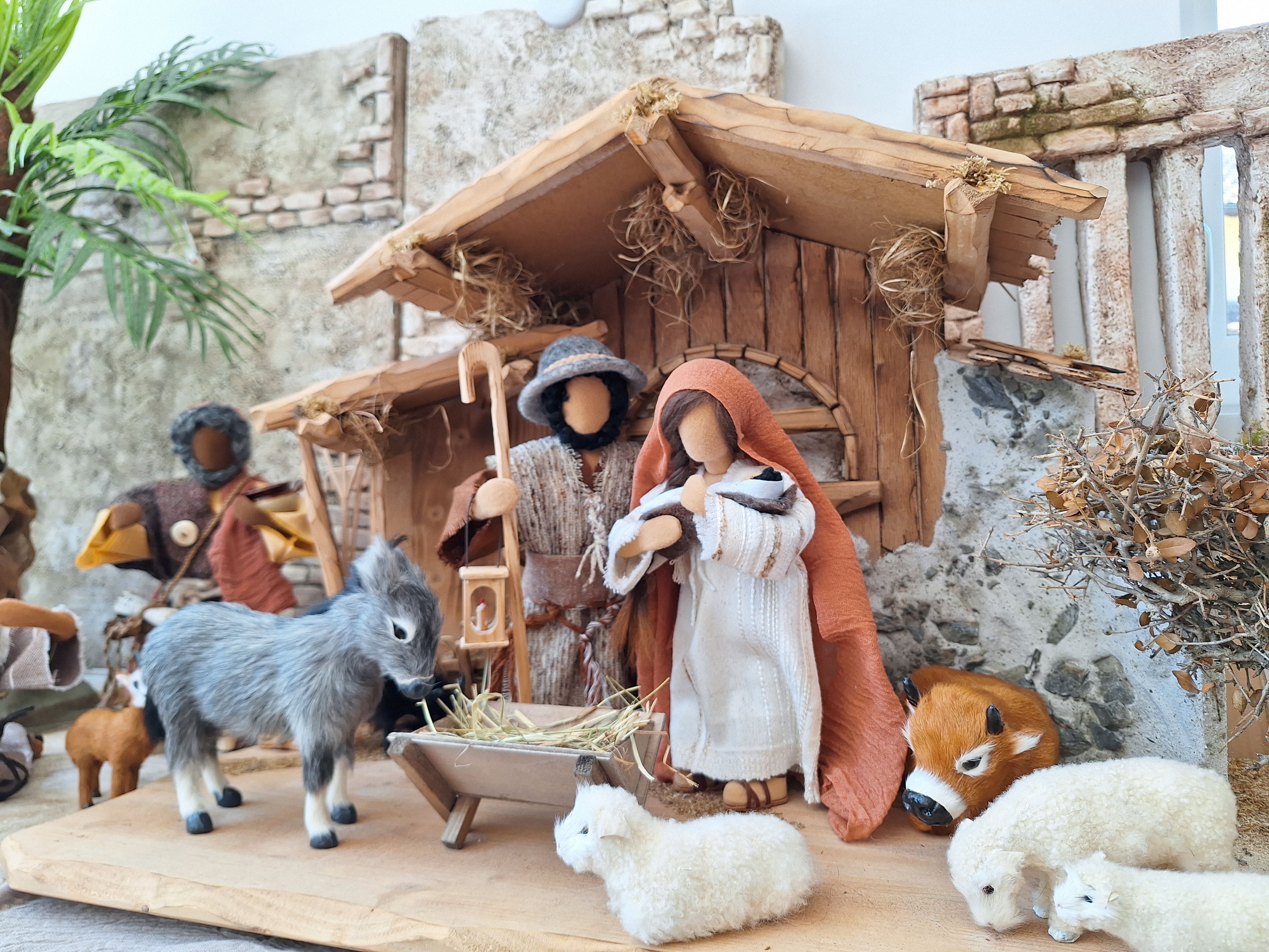 Maria ist in blau-rot gekleidet. Sie trägt liebevoll ihr Kind im Arm. Das Jesuskind ist aufwändig mit Händchen gefertigt. Die kann es ablegen oder der Mutter freudig entgegenstrecken. Josef passt farblich zur Maria. Er trägt einen handgefilzten Hut sowie eine im Inland handgefertigte Laterne und einen geschnitzten Stab.
