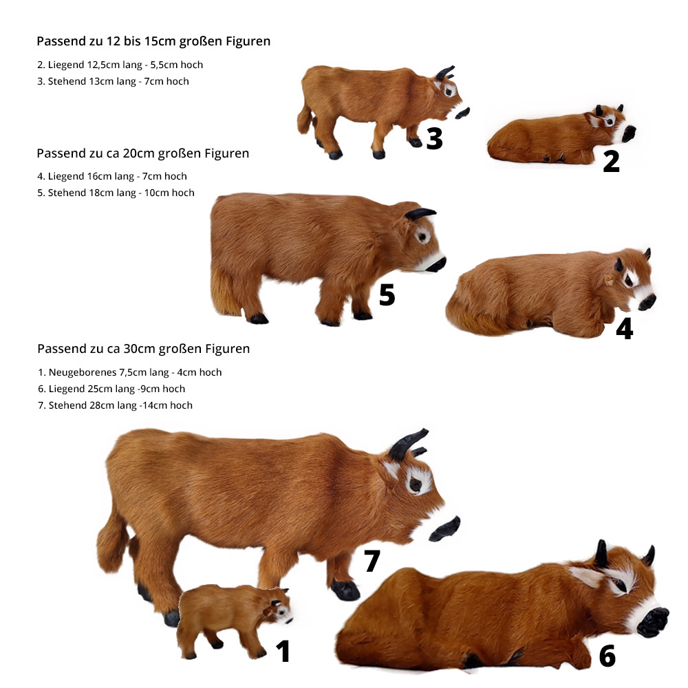 Die kleinste der Kühe ist durch seine nur 7,5cm Länge wirklich sehr bezaubernd. Sie ist gerade geboren worden und macht die ersten Gehversuche. Das neugeborene Kälbchen passt zu jeder anderen Kuh/Ochse, egal welcher Größe, und lässt auch in jeder Weihnachtskrippe noch einen lieblichen Hauch von Gebor(g)ensein entstehen.