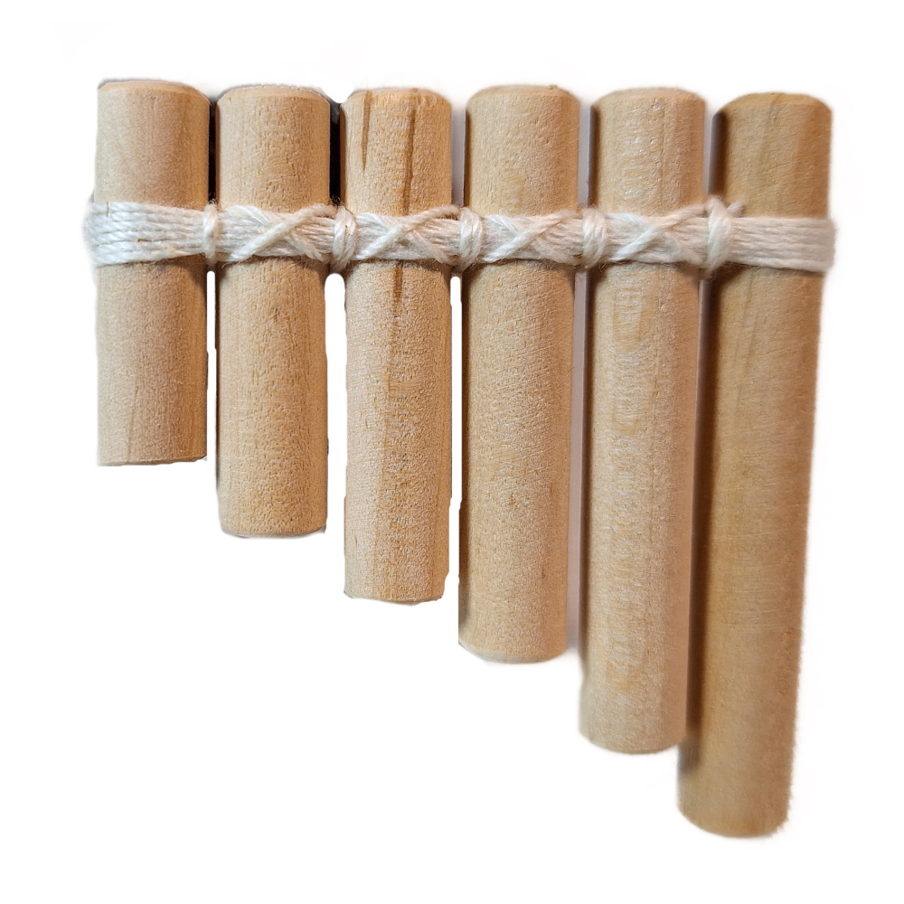 Sehr schön gefertigte Panflöte. Sechs Holzröhren, in die sogar ein Blaseloch gebohrt wurde, sind mit Garn kunstvoll verknüpft. So ergibt sich ein schönes Bindemuster, das die Flöte sehr stabil macht.