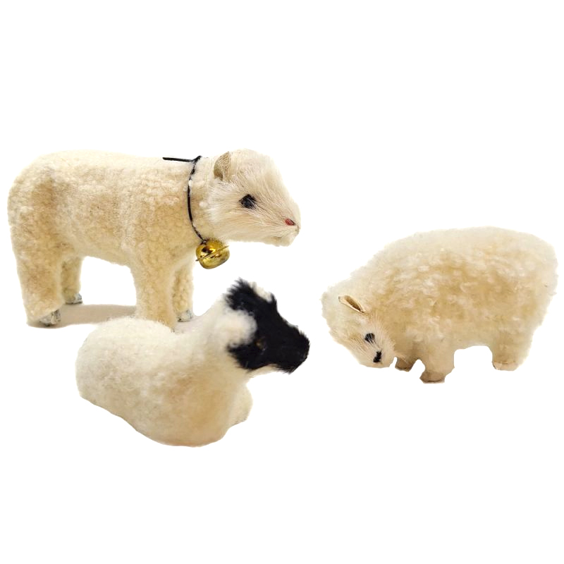 Die Schafe und Lämmer aus der Felltierserie sind mit echtem Schaffell überzogen. Sie sind unbeweglich, aber in den Haltungen "stehend", "fressend" und "liegend" erhältlich. Sie passen in der Größe zu 25-30cm große Figuren und zum Ochsen, dem Esel und zum Kamel, den anderen Felltieren aus unserem Sortiment.