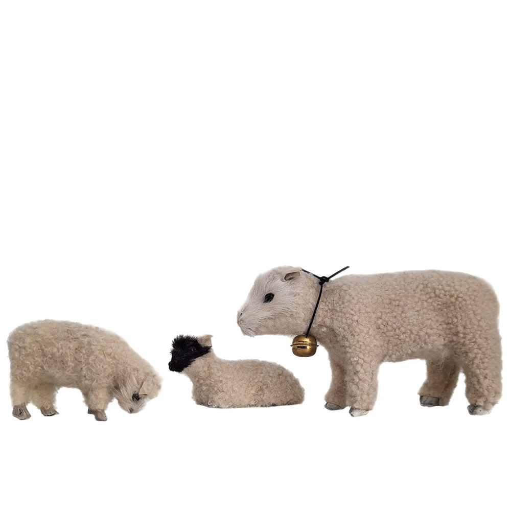 Das stehende Muttertier hat eine Glocke umgebunden, die zwei Lämmer nehmen unterschiedliche Körperhaltungen ein - je nach Vorrat.Das Schaf ist 12cm lang, die Lämmer je 9cm.Die Schafe und Lämmer aus der Felltierserie sind mit echtem Schaffell überzogen. Sie sind unbeweglich, aber in den Haltungen "stehend", "fressend" und "liegend" erhältlich. Sie passen in der Größe zu 25-30cm große Figuren und zum Ochsen, dem Esel und zum Kamel, den anderen Felltieren aus unserem Sortiment.