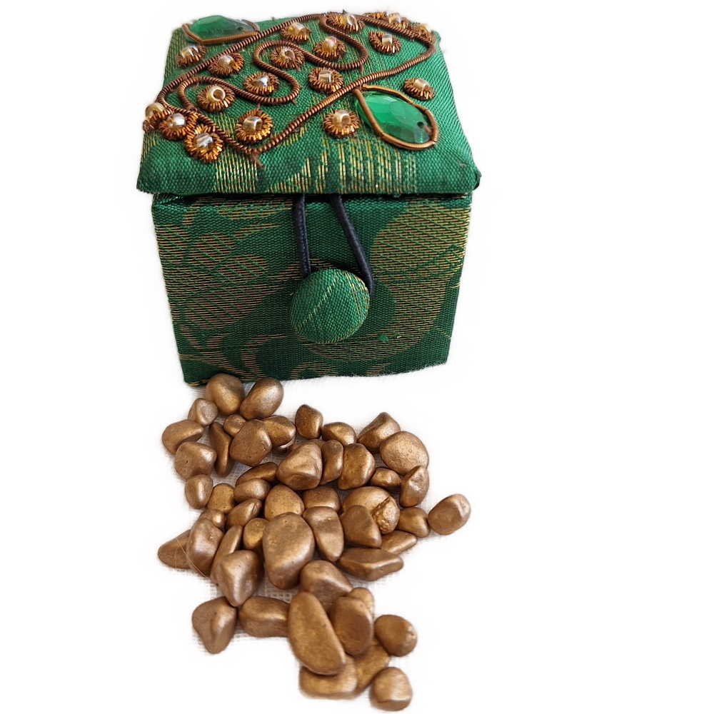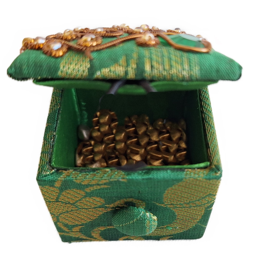 Mit echten Seidenstoffen aus Indien sind diese stabilen Schatztruhen handgefertigt  Auf dem Deckel hat jede Truhe ein schillerndes Zierornament in immer neuer Variation, sodass jede Truhe ein Einzelstück ist.