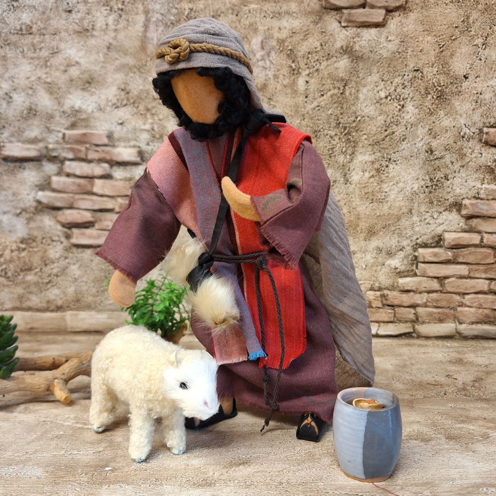 Der gute Hirte sieht sehr sanftmütig aus. Die zarten Grüntöne seiner Kleidung unterstreichen diesen Charakter. Er hat eine schöne gefüllte Felltasche umgebunden und einen Naturstab. Das Lämmchen hat er gefunden und trägt es nach Hause.