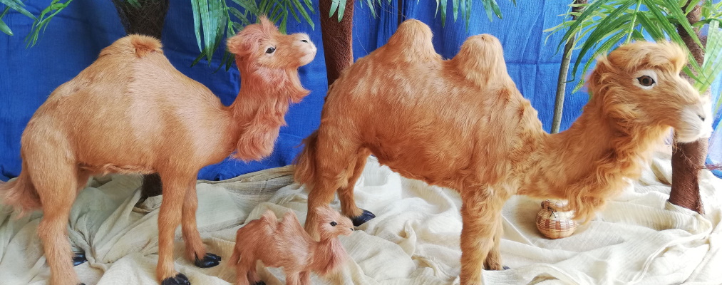 33cm hoch - 40cm langDie Kamele sind mit Rinderfell überzogen. Sie sind sehr detailgetreu gefertigt. Da Fell ein Naturprodukt ist, sieht jedes Tier etwas anders aus. Rinderfell ist ein Abfallprodukt der Nahrungskette. Es werden wegen des Fells keine Tiere getötet.Kleine Kamellehre:Einhöckrige Tiere nennt man Dromedare, zweihöckrige Trampeltiere. Beide Arten sind in allen Wüstengebieten unserer Welt vertreten und auch zu Zeiten Jesu hat es beide Arten gegeben. Ein ausgewachsenes Kamel überragt einen Menschen um ein- bis drei Kopflängen. Deshalb ist das 26cm große Tier als Teenager zu betrachten. Man kann es zur 30cm großen Figuren gelten lassen, die richtige Größe haben aber die beiden Tiere über 30cm.Das einhöckrige Kamel 33cm hoch ist zierlicher gebaut, hat dünnere Beine.Das zweihöckrige Kamel 35cm hoch ist robuster.Es ist reine Geschmacksache, welches Tier dir besser gefällt.Der Sattel:Den Sattel ist aus Holz, im Inland gefertigt. Die Satteldecke nähen wir in unserem Atelier.Ein Sattel ist Notwendigkeit, wenn man auf einem Kamel reiten möchte. Er eignet sich auch perfekt, um Lastenteile am Kamel anzubringen.Die Trense:Wir fertigen sie aus grob gesponnener Filzschnur. An jeder Trense hängt ein Schmuckstück vorne herunter, die Modelle variieren.