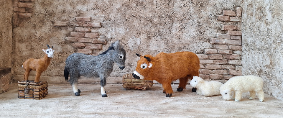 In dieser harmonischen Gruppe haben sich folgende Stalltiere zusammengefunden:* Esel stehend: 18cm hoch - 22cm lang & Satteldecke & Ledertrense* Ochse liegend: 25cm lang - 9cm hoch* Schaf: 11,5cm lang - 10,5cm hochGeschenkt dazu:* Heuballen* Stallwerkzeug nach VorratDie Tiere sind aus Rinder- Schaf- und Ziegenfell sehr detailgetreu gefertigt.