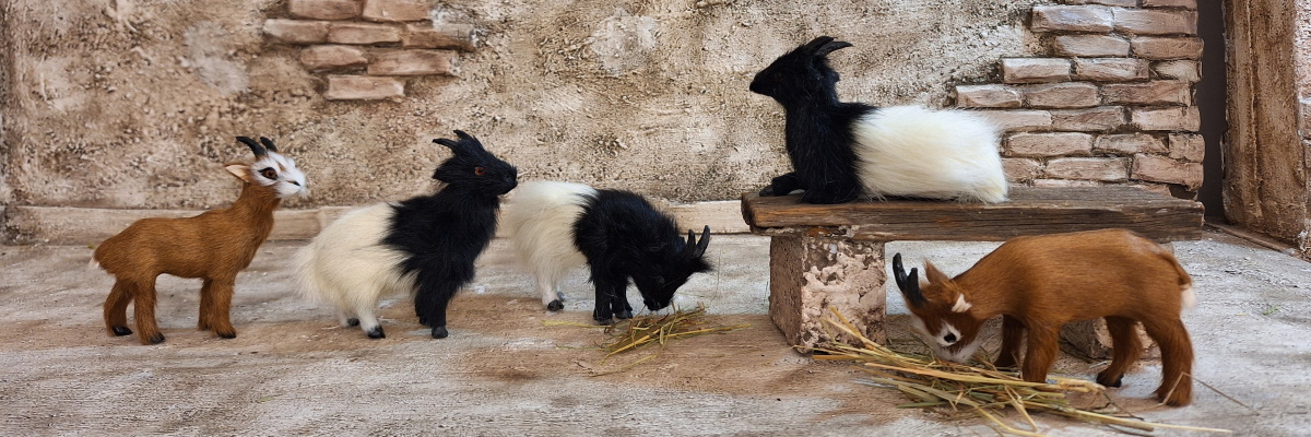 Die stehende Ziege ist sehr schön und detailgetreu aus Rinderfell gefertigt. Sie ist 11cm lang und 11cm hoch.Besonders wohl fühlt sie sich im Stall auf einem erhöhten Platz. Sie hat noch einen Bruder, der frisst gerade Heu.
