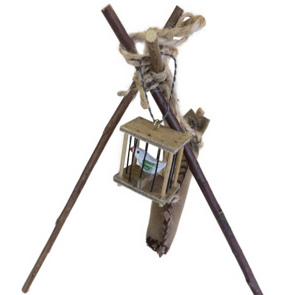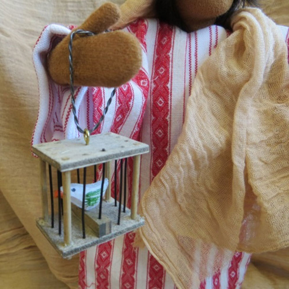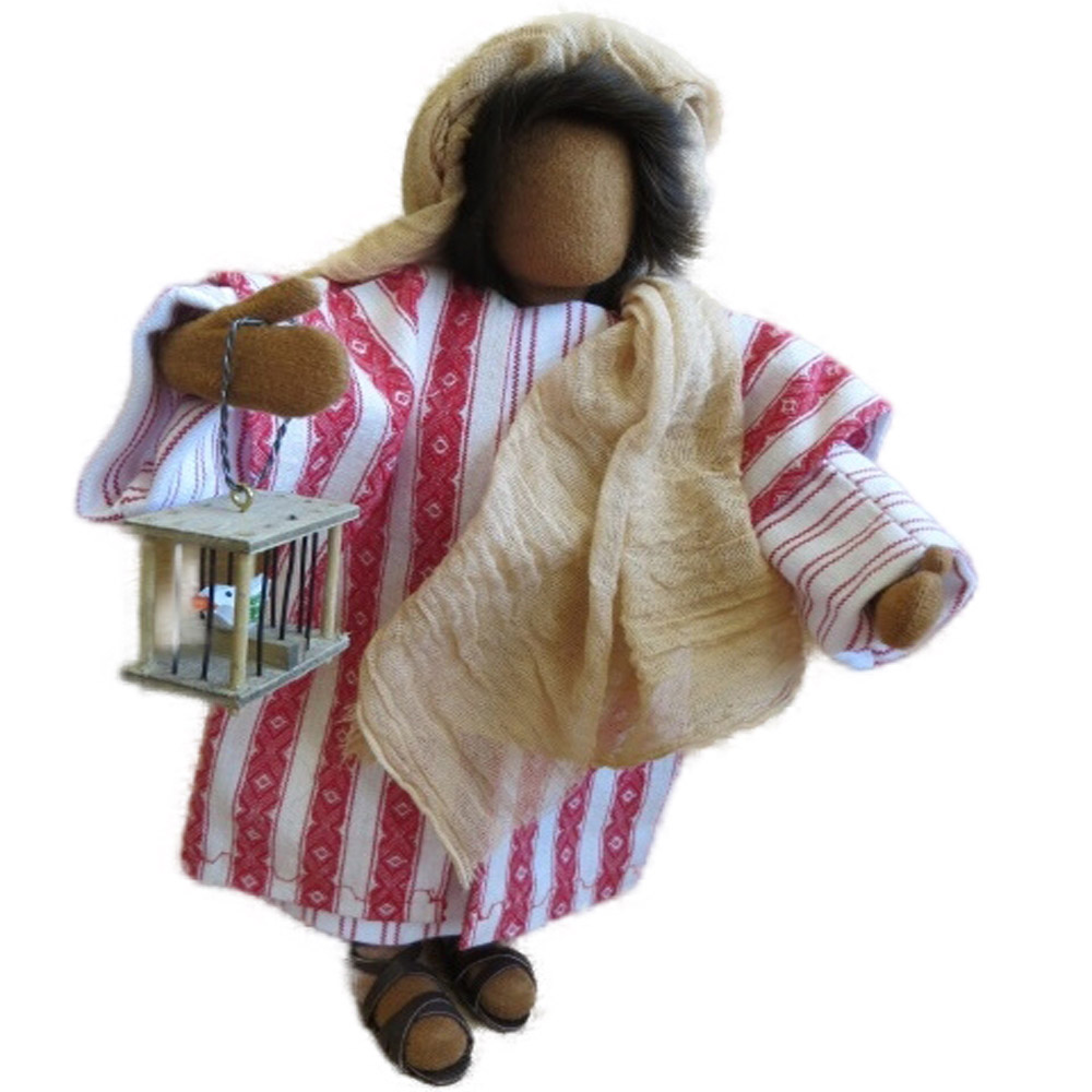 Käfig und Vogel sind aus Holz und passen wunderbar zum Stil unserer Figuren. Vielleicht wird der Vogel auf dem Markt verkauft oder er ist der beste Freund vom Flötenspieler. Vielleicht haben Abraham und Sara ihn gefangen und er wohnt bei ihnen im Nomadenzelt.