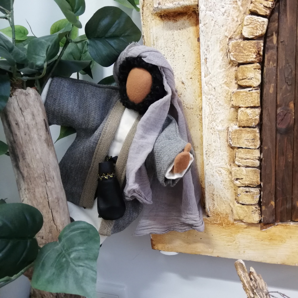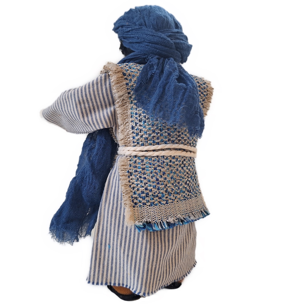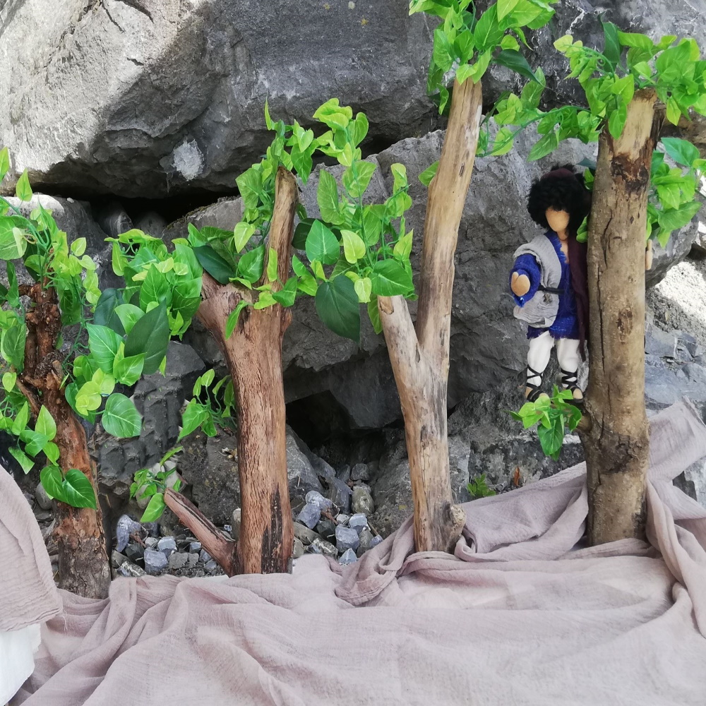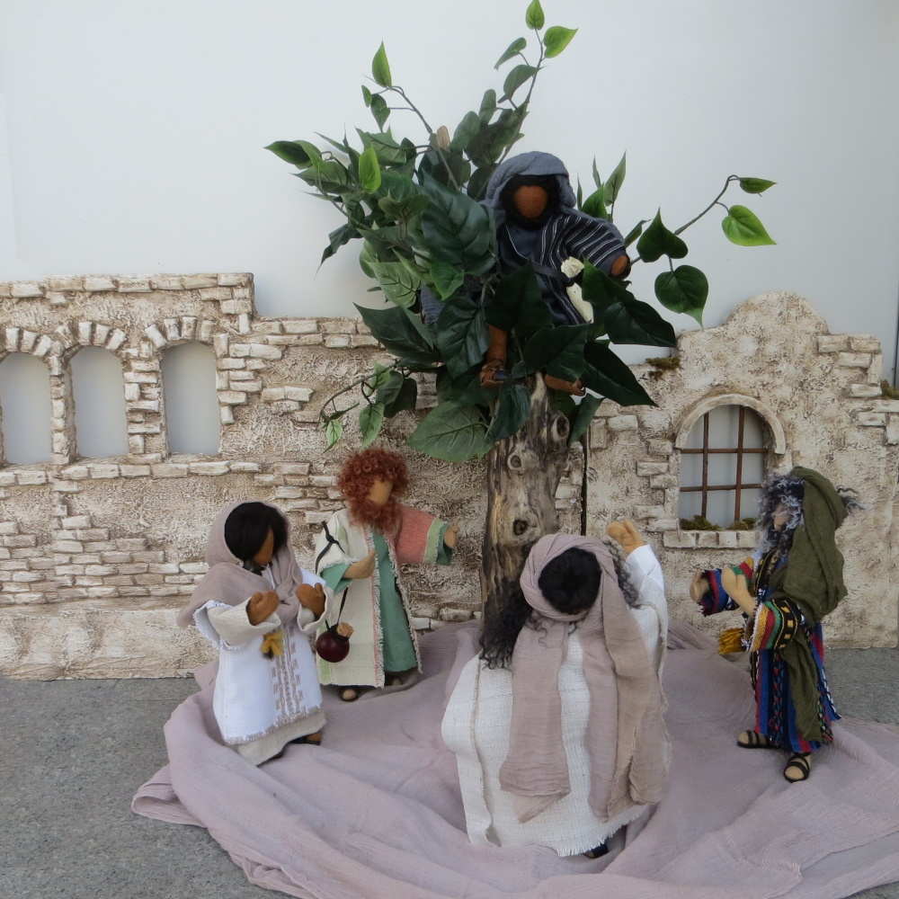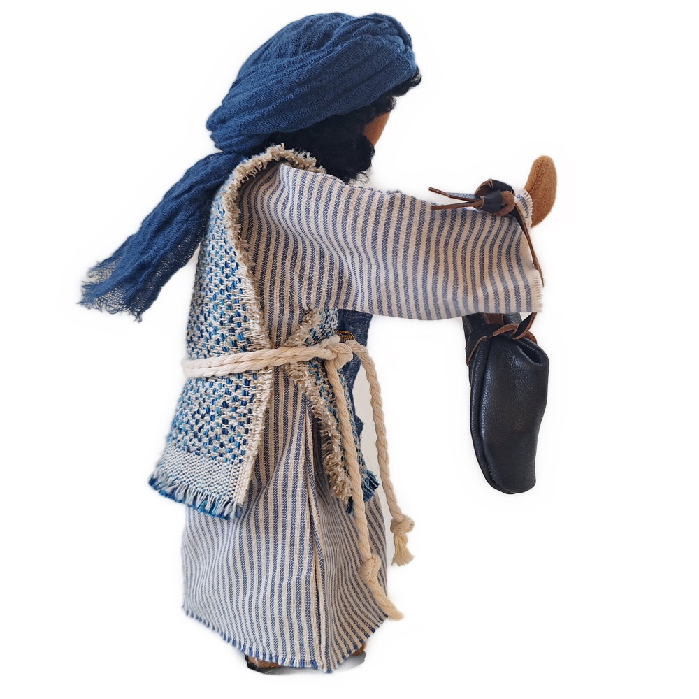 Zachäus war Zöllner. Er wollte Jesus sehen und stieg auf einen Baum, weil er ein recht kleiner Mann war. Deshalb ist unser Zachäus nur 25cm hoch. Als reicher Mann trägt er ein schönes Gewand mit goldener Gürtelschnalle.