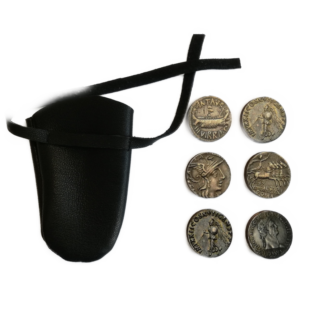 Einen ledernen Münzbeutel hat er dabei. Darin befinden sich sechs römische Münzen.